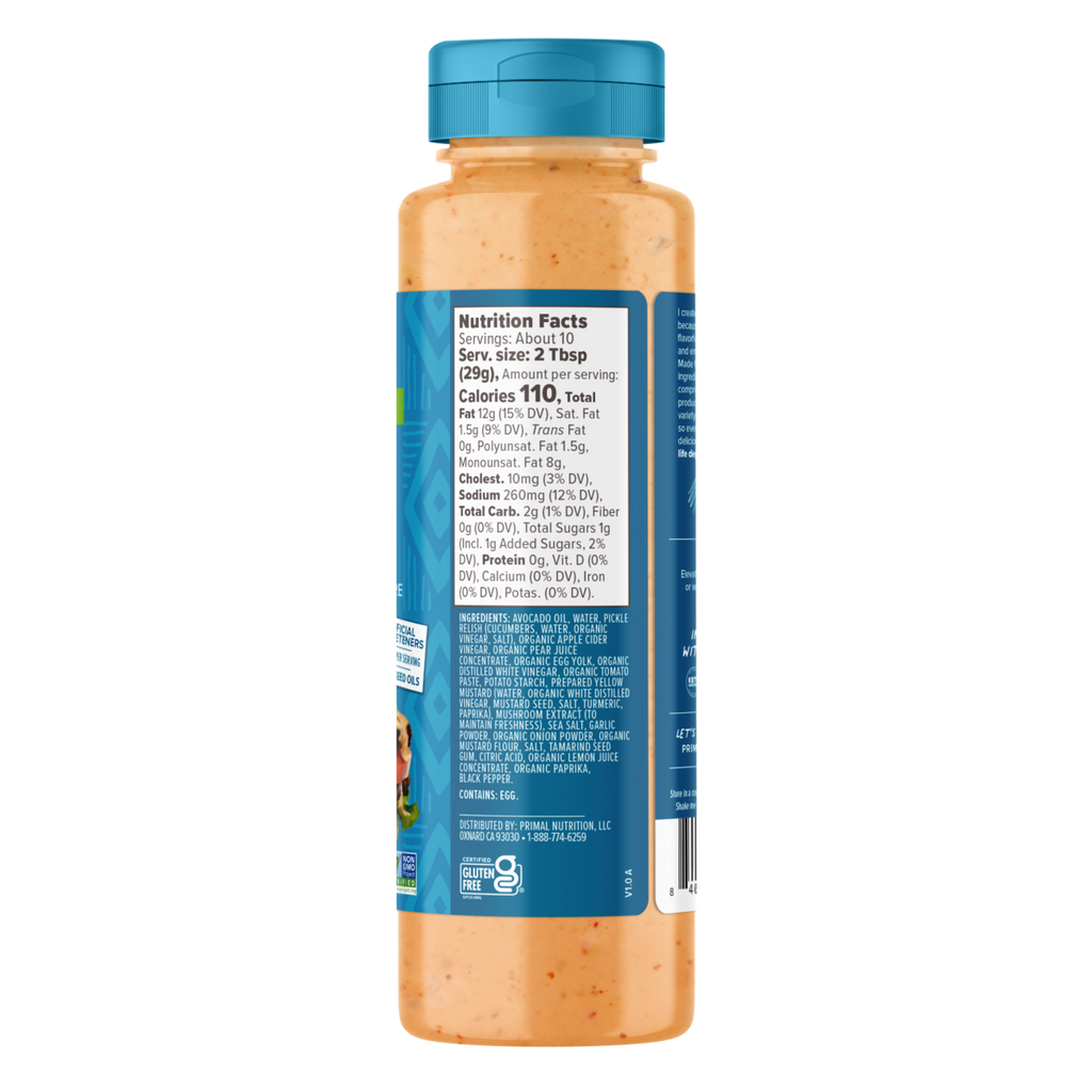 Ingredients: Avocado Oil, Water, Pickle Relish (Cucumbers, Water, Organic Vinegar, Salt), Organic Apple Cider Vinegar, Organic Pear Juice Concentrate, Organic Egg Yolk, Organic Distilled White Vinegar, Organic Tomato Paste, Potato Starch, Prepared Yellow Mustard (Water, Organic White Distilled Vinegar, Mustard Seed, Salt, Turmeric, Paprika), Mushroom Extract (to maintain freshness), Sea Salt, Garlic Powder, Organic Onion Powder, Organic Mustard Flour, Salt, Tamarind Seed Gum, Citric Acid, Organic Lemon Juice Concentrate, Organic Paprika, Black Pepper Contains: Egg.