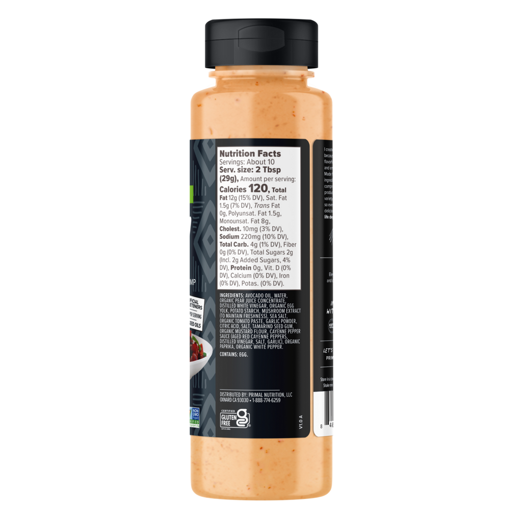 Ingredients: Avocado Oil, Water, Organic Pear Juice Concentrate, Distilled White Vinegar, Organic Egg Yolk, Potato Starch, Mushroom Extract (to maintain freshness), Sea Salt, Organic Tomato Paste, Garlic Powder, Citric Acid, Salt, Tamarind Seed Gum, Organic Mustard Flour, Cayenne Pepper Sauce (Aged Red Cayenne Peppers, Distilled Vinegar, Salt, Garlic), Organic Paprika, Organic White Pepper. Contains: Egg.