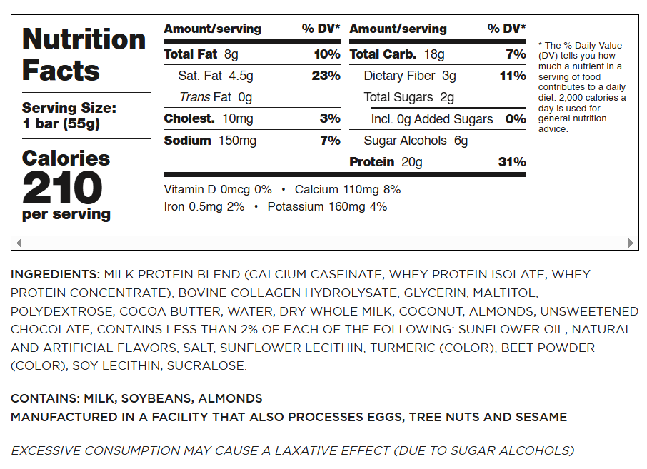 INGREDIENTS: MILK PROTEIN BLEND (CALCIUM CASEINATE, WHEY PROTEIN ISOLATE), GLYCERIN, MALTITOL, POLYDEXTROSE, BOVINE COLLAGEN HYDROLYSATE, COCOA BUTTER, WATER, DRY WHOLE MILK, ROASTED ALMOND PIECES, SOY PROTEIN ISOLATE, SUNFLOWER OIL, COCOA PROCESSED WITH ALKALI, TAPIOCA STARCH, NATURAL AND ARTIFICIAL FLAVORS, SALT, SUCRALOSE, SUNFLOWER LECITHIN, UNSWEETENED CHOCOLATE.