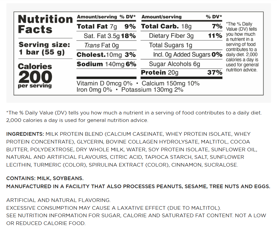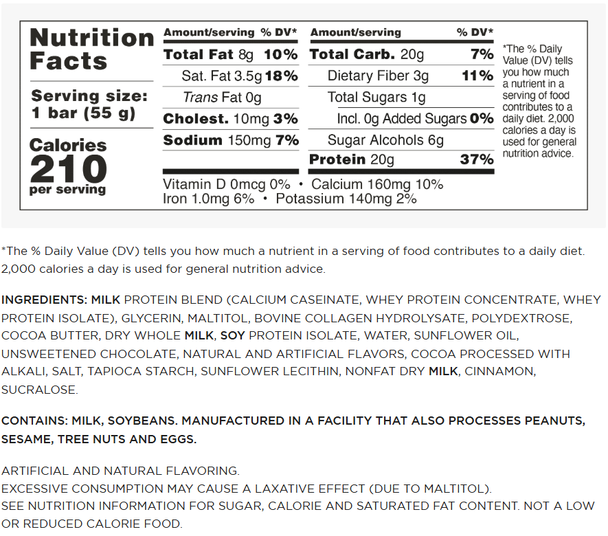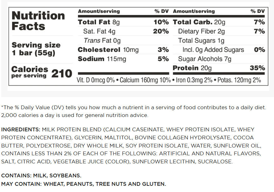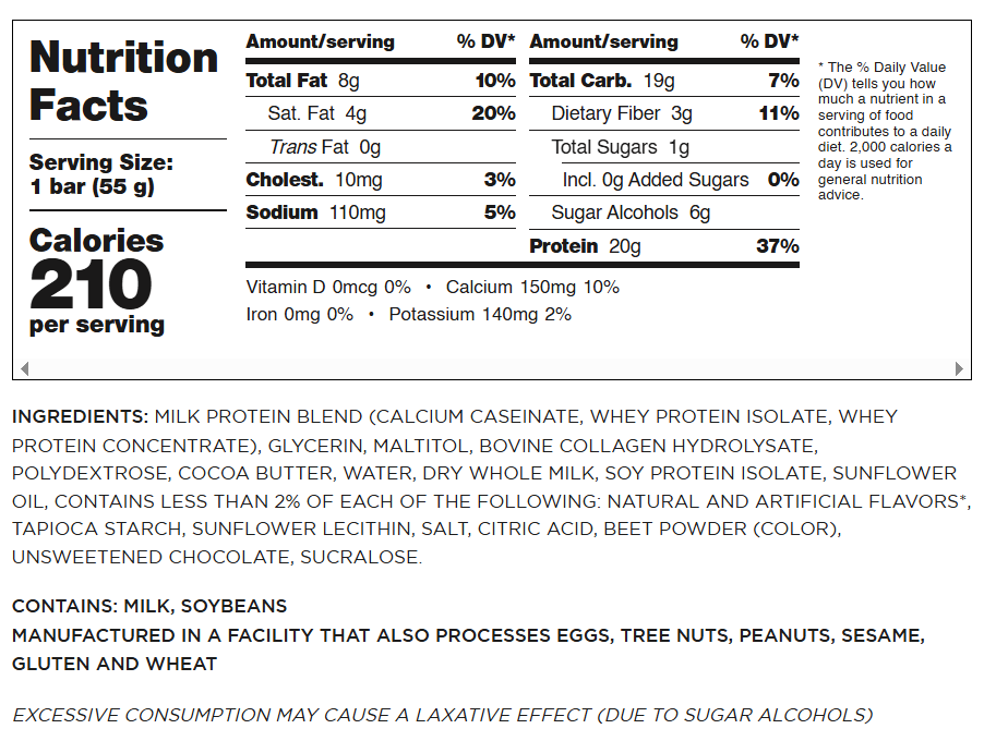 INGREDIENTS: MILK PROTEIN BLEND (CALCIUM CASEINATE, WHEY PROTEIN ISOLATE, WHEY PROTEIN CONCENTRATE), GLYCERIN, BOVINE COLLAGEN HYDROLYSATE, MALTITOL, POLYDEXTROSE, COCOA BUTTER, DRY WHOLE MILK, WATER, SOY PROTEIN ISOLATE, SUNFLOWER OIL, UNSWEETENED CHOCOLATE, COCOA PROCESSED WITH ALKALI, TAPIOCA STARCH, NATURAL AND ARTIFICIAL FLAVORS, SALT, SUNFLOWER LECITHIN, SUCRALOSE.