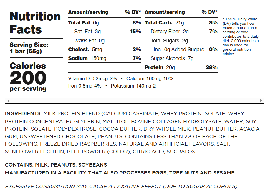 INGREDIENTS: MILK PROTEIN BLEND (CALCIUM CASEINATE, WHEY PROTEIN CONCENTRATE, WHEY PROTEIN ISOLATE), GLYCERIN, BOVINE COLLAGEN HYDROLYSATE, MALTITOL, POLYDEXTROSE, WATER, COCOA BUTTER, DRY WHOLE MILK, ROASTED PEANUT PIECES, PEANUT PASTE (PEANUTS), SUNFLOWER OIL, UNSWEETENED CHOCOLATE, COCOA PROCESSED WITH ALKALI, SALT, ARTIFICIAL AND NATURAL FLAVORS, SUNFLOWER LECITHIN, SUCRALOSE.