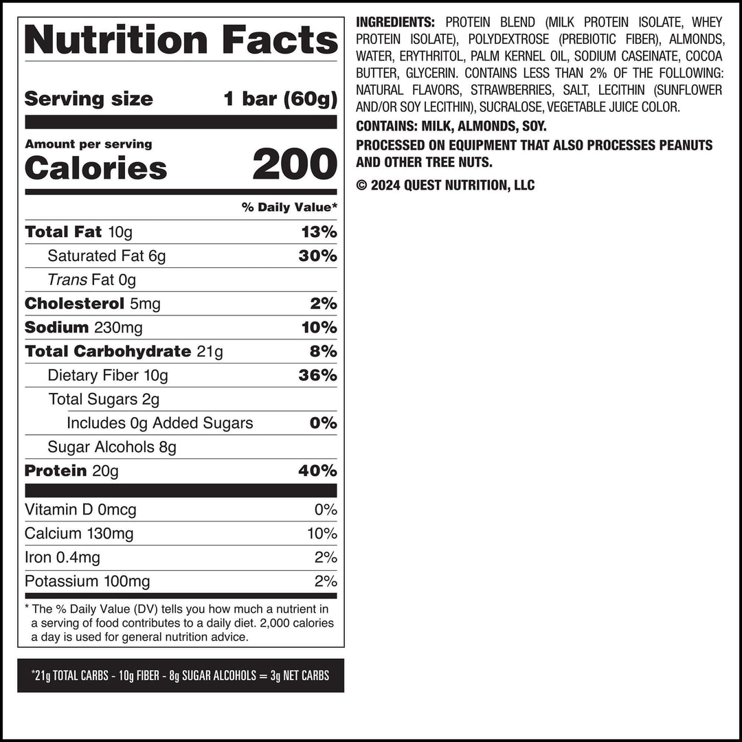 Quest Bars are the perfect nutrition bar for anyone looking to get top-quality protein while dropping some carbs from their diet. They're as delicious and convenient as a candy bar while maintaining all of the nutrition of a carefully prepared meal that's packed with fiber to make you feel full. Quest Bars are low carb, gluten-free, high protein bars with no unnecessary ingredients or extra carbs.