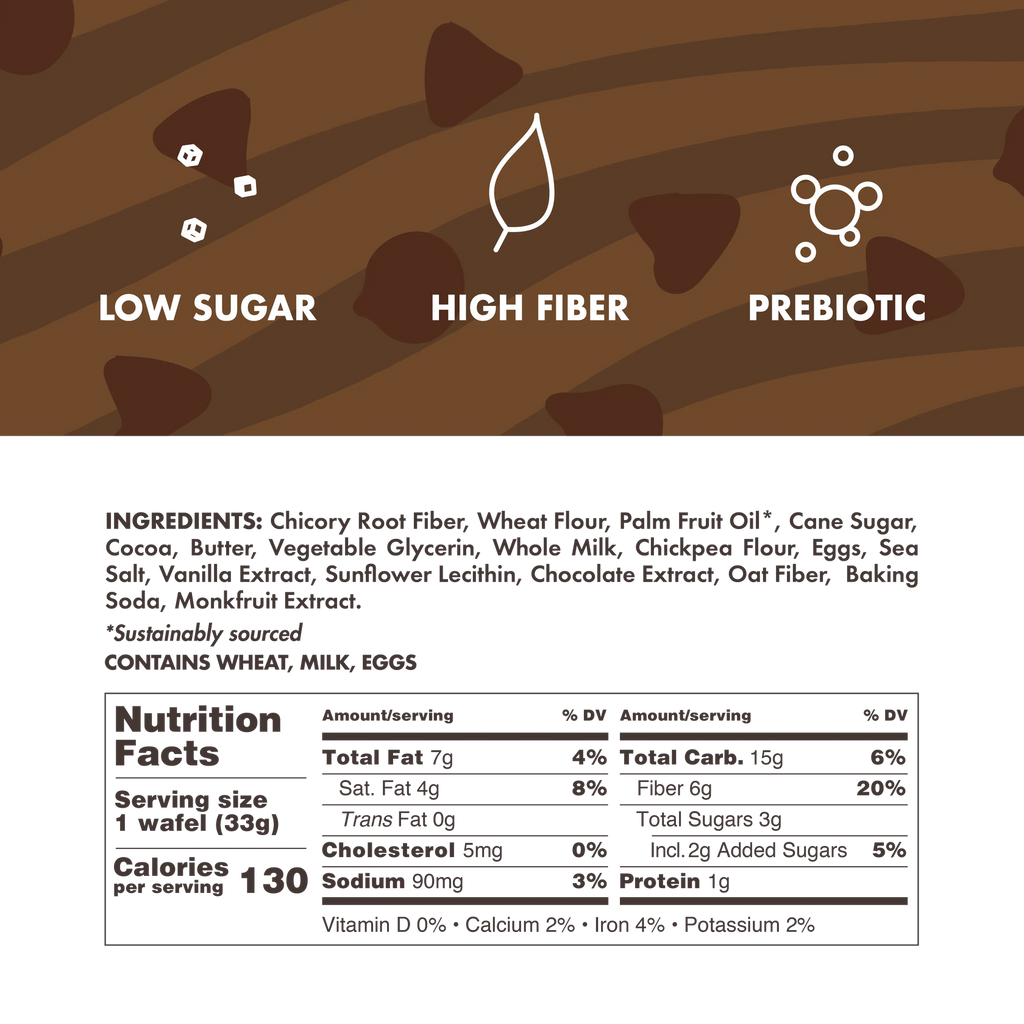 SugarIndulge with Rip Van's rich, chewy, chocolate on chocolate snack wafel. The inspiration behind Rip Van Wafel was to bring Americans a unique, guiltless and indulgent snack. The third iteration of the reinvented dutch stroopwafel has just 3 grams of sugar. That's 88% less than America's most popular candy bar with 58% less net carbs and 6X the fiber. Now go and indulge without the guilt!