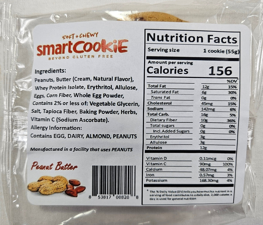Smart Baking Company SmartCookie is a thick, chewy, low carb cookie that will take you back to that fresh-from-the-oven, home-baked goodness you remember from your childhood ... without all the sugar, starch and gluten. Smart Baking Company SmartCookies are packed full of fiber and protein to keep you full and satisfied. Sweetened with erythritol and allulose, SmartCookies are gluten free and keto friendly.