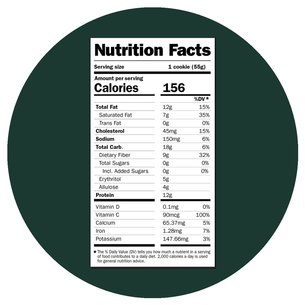 CHOCOLATE CHIP INGREDIENTS: Butter, Sugar-Free Chocolate Chips (Unsweetened Chocolate, Erythritol, Cocoa Butter, Stevia Extract, Sunflower Lecithin), Whey Protein Isolate, Erythritol, Allulose, Eggs, Almond Flour, Corn Fiber, Whole Egg Powder, Contains 2% or Less of: Pure Vanilla, Vegetable Glycerin, Salt, Tapioca Fiber, Baking Powder, Herbs, Vitamin C (Sodium Ascorbate). CONTAINS: EGG, DAIRY, ALMOND.
