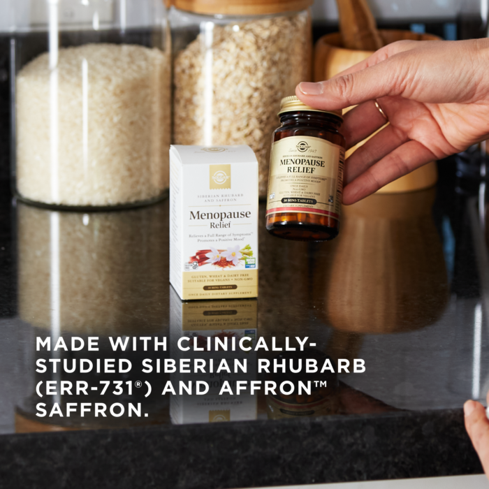 Only Solgar® Menopause Relief combines the hormone-free, clinically studied ingredients Siberian Rhubarb (ERr-731®) and affron™ Saffron.