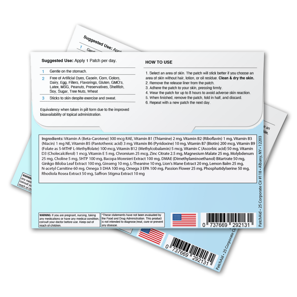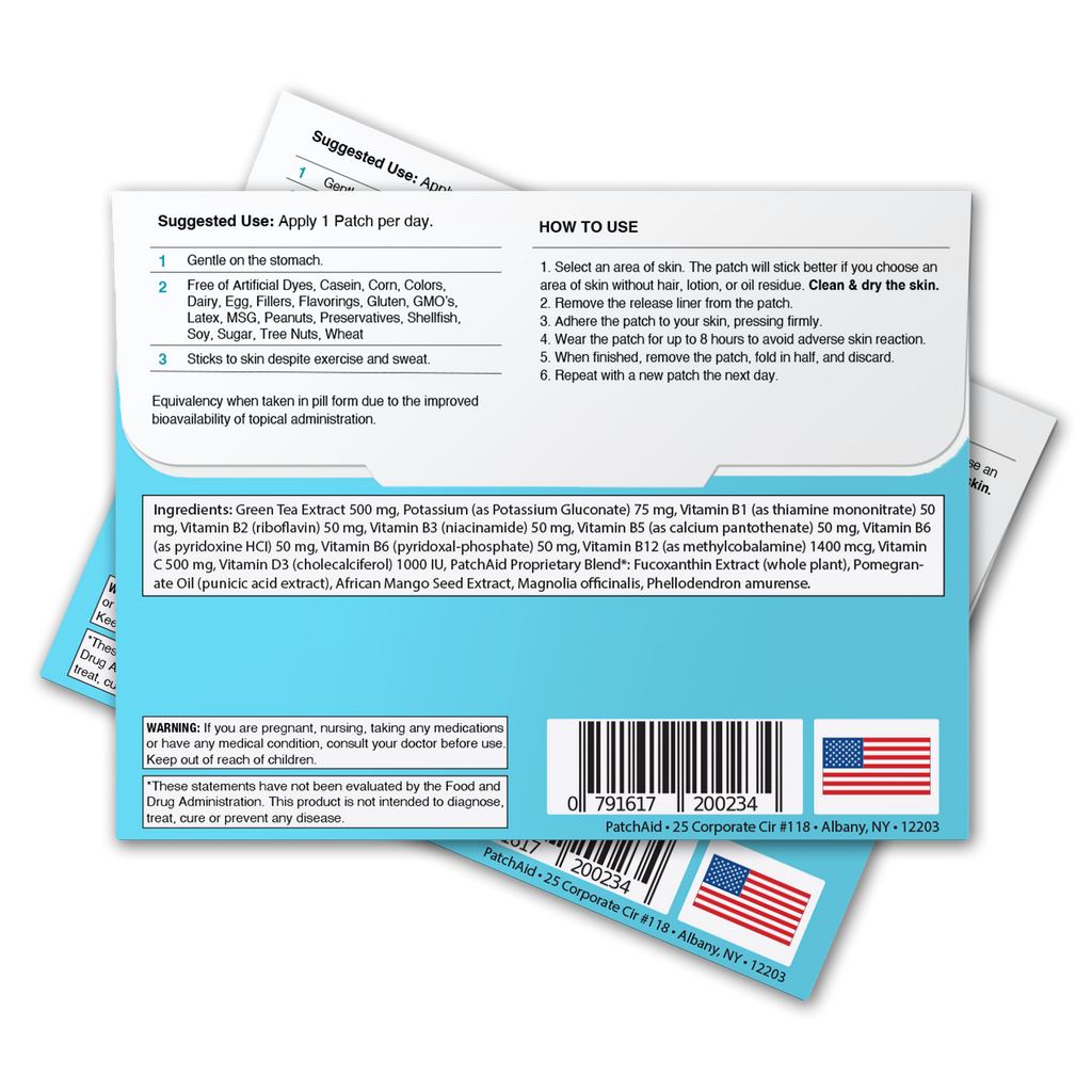 Please Note: Nutritional patches are a new technology. As with any nutritional supplements, consumers should use nutrition patches according to their healthcare providers' recommendations and regularly monitor nutrient levels through lab work as they would when taking any dietary supplements.