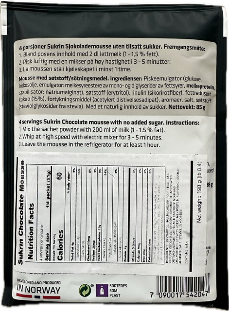 The mousse can also be made with soy milk, oat milk, almond milk, and similar alternatives. One packet of Sukrin Chocolate mousse provides four servings.