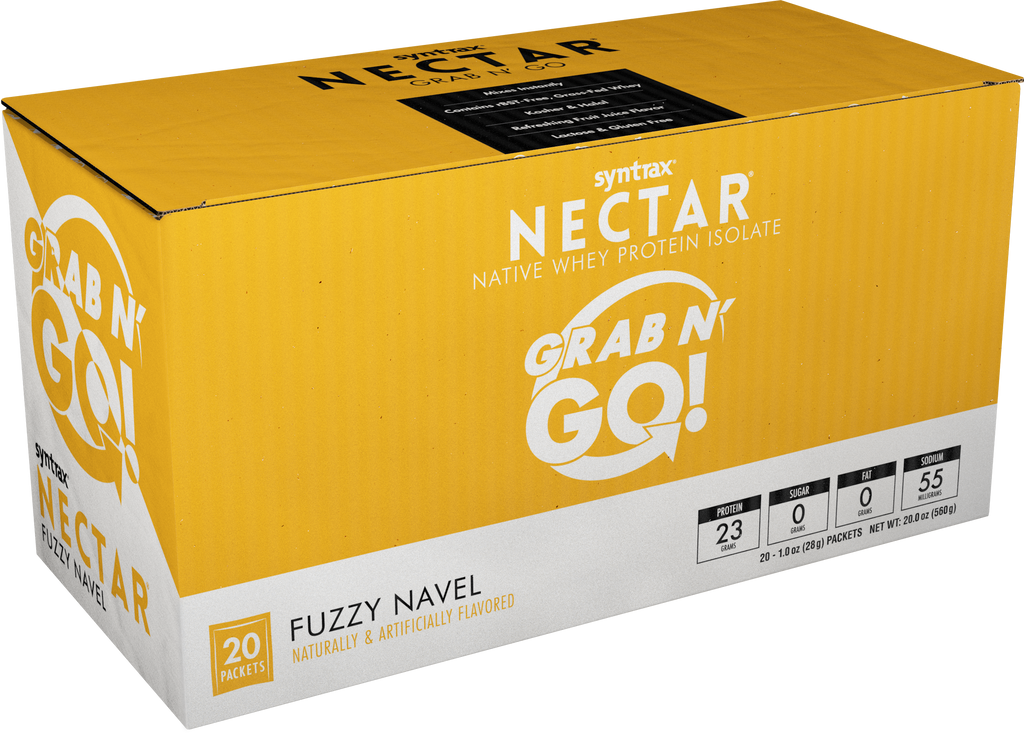 20 single scoop servings of Syntrax Nectar Protein Powder packets in each Grab N' Go Box - Fuzzy Navel.
