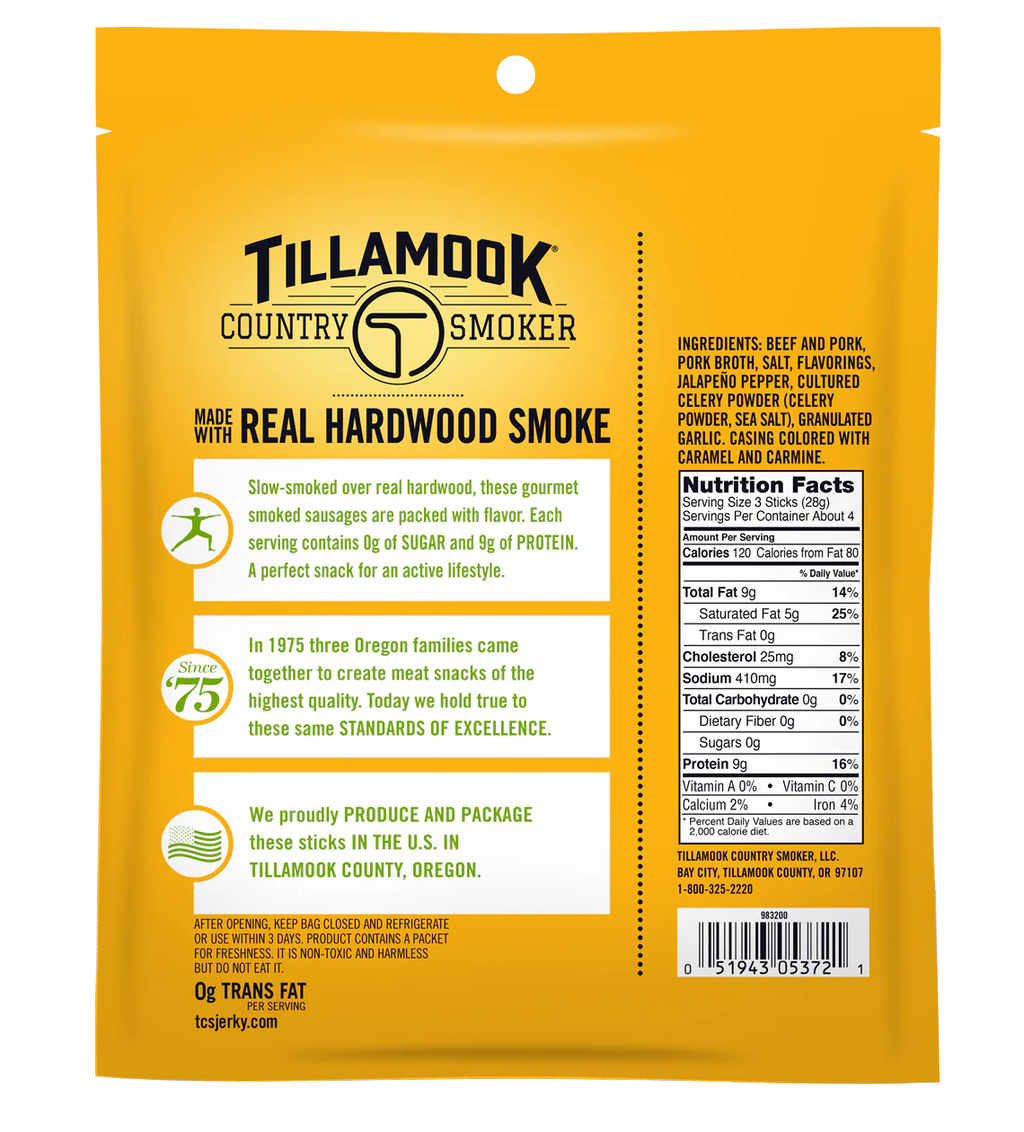 - Featuring the same great taste of Tillamook Country Smoker's real, hardwood smoked snack sticks, so you can indulge without the guilt