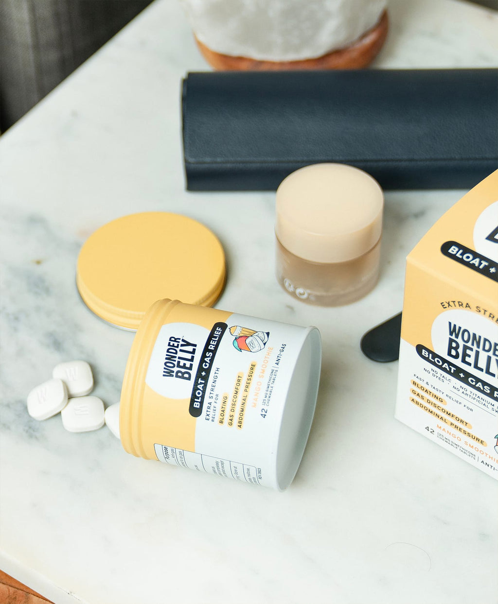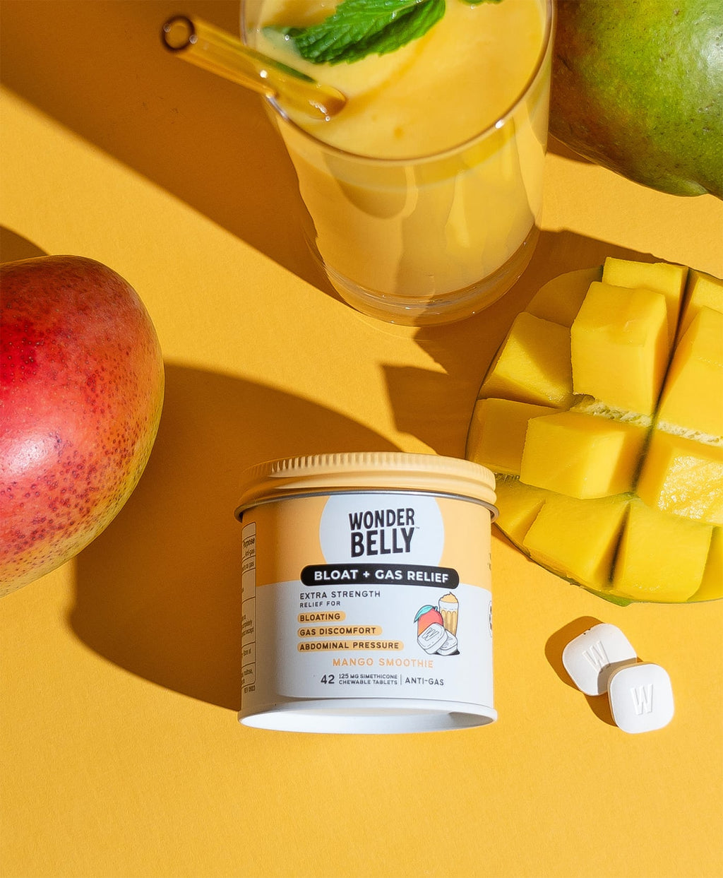 Bloating happens. Gas pressure happens. Wonderbelly makes it easier to feel like yourself again, fast. Wonderbelly Bloat + Gas Relief is an extra-strength chewable that helps relieve bloating, gas discomfort, fullness, and abdominal pressure using 125 mg simethicone per tablet, the same active ingredient used by leading anti-gas brands.