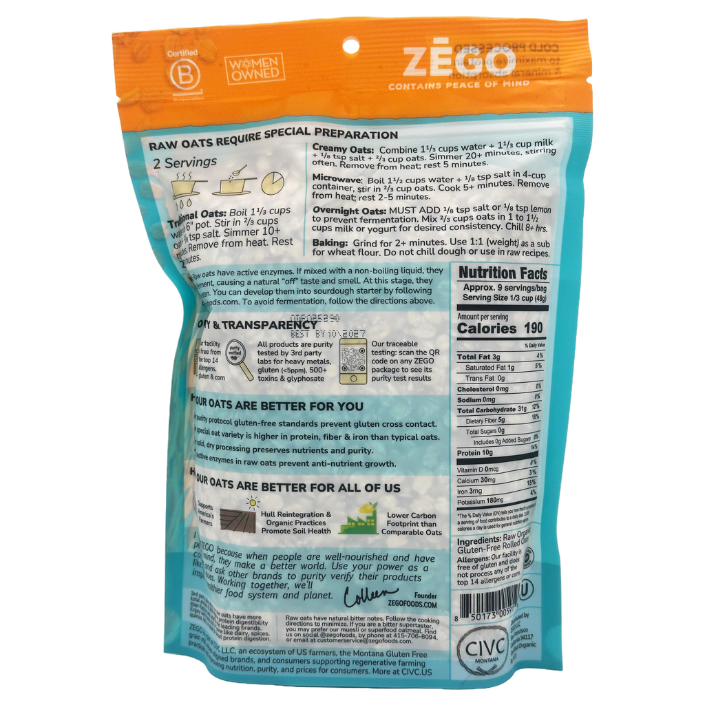 Experience the delicious, robust flavor of Zego's organic, raw, purity protocol gluten-free rolled oats!